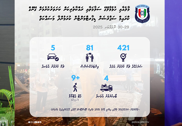 ވޭތުވެދިޔަ 48 ގަޑިއިރު މާލެއިން ހަތަރު އުޅަނދެއް ޓޯވްކޮށްފި ކަމަށް ފުލުހުން ވިދާޅުވެއްޖެއެވެ. މާލެތެރެ ބެލެހެއްޓުމަށް ކުރަމުންދާ ޕެޓްރޯލްގެ ތެރެއިން ވަނީ އެވަގުތު ފަސް އުޅަނދެއް ޗެކުކޮށްފައެވެ. ފާއިތުވި 48 ގަޑިއިރު ތެރޭގައި މާލެއާއި ހުޅުމާލޭގެ އެކި ސަރަހައްދުތަކުގައި ފުޓްޕެޓްރޯލްކޮށް ބަލަހައްޓާފައިވާ ކަމަށްވެސް ފުލުހުން ވިދާޅުވިއެވެ. އެގޮތުން ޖުމްލަ 9 ގަޑިއިރަށްވުރެ ގިނަ ވަގުތު ފުލުހުން ފުޓްޕެޓްރޯލް ކޮށްފައި ކަމަށްވެސް ވިދާޅުވެފައިވެއެވެ. މާލޭގެ ސަލާމަތާއި ރައްކާތެރިކަން ކަށަވަރުކުރުމަށް ފުލުހުން ކުރަމުންދާ މަސައްކަތުގައި ފާއިތުވި 48 ގަޑިއިރުގެ ތެރޭގައި […]