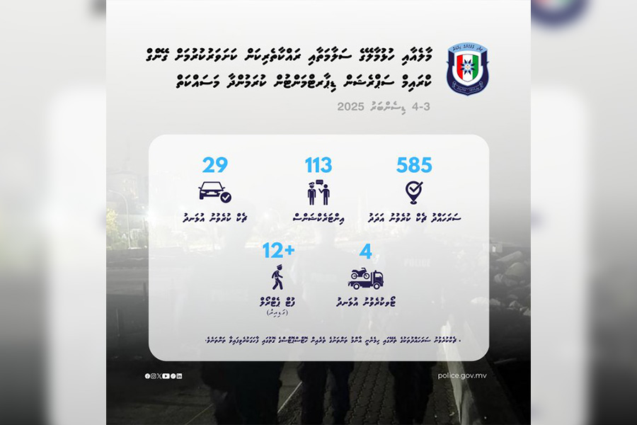 މާލޭގެ ސަލާމަތާއި ރައްކާތެރިކަން ކަށަވަރުކުރުމަށް ފުލުހުން ކުރަމުންދާ މަސައްކަތުގައި ފާއިތުވު 48 ގަޑިއިރުތެރޭގައި ވަނީ ނަވާވީސް އުޅަނދެއް ޗެކްކޮށްފައި ކަމަށް ފުލުހުން ވިދޅުވިއެވެ. އަދި ހަތަރު އުޅަނދެއް ވަނީ ޓޯކޮށްފައި ކަމަށް ވެސް ވިދާޅުވެފައިވެއެވެ. ފުލުހުން ވިދާޅުވެފައިވަނީ ގޭންގް ކްރައިމް ސަޕްރެޝަން ޑިޕާރޓްމަންޓުން ހިންގި މި އޮޕަރޭޝަނުގައި ވަނީ ”ހޮޓްސްޕޮޓްސްގެ ގޮތުގައި ފާހަގަކުރެވޭ ސަރަހައްދުތައް 585 ފަހަރު ބަލައިފާސްކޮށް، 113 އިންޓަރެކްޝަން ހަދާފައިވެއެވެ.“ އަދި މާލޭގެ އެކި ސަރަހައްދުތަކުގައި ފުޓްޕެޓްރޯލްކޮށް ބަލަހައްޓާފައިވާ ކަމަށާއި، ޖުމްލަ 12 ގަޑިއިރަށްވުރެ […]