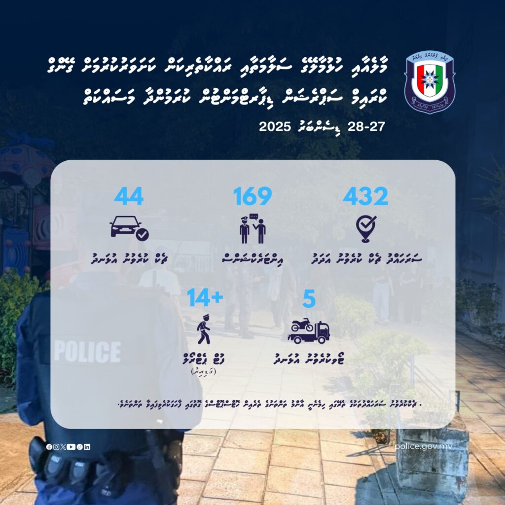 ފާއިތުވިސް 48 ގަޑިއިރުތެރޭ މާލެއިން ފަސް އުޅަނދެއް ޓޯވކޮށްފި ކަމަށް ފުލުހުން ވިދާޅުވެއްޖެއެވެ. ފުލުހުން ވިދާޅުވީ އެވަގުތުތަކުގައި 44 އުޅަނދެއް ބަލައި ޗެކްކޮށްފައިވާ ކަމަށެވެ. މިއީ މާލޭގެ ސަލާމަތާއި ރައްކާތެރިކަން ކަށަވަރުކުރުމަށް ފުލުހުން ކުރަމުންދާ މަސައްކަތުގެ ތެރެއިން ގޭންގް ކްރައިމް ސަޕްރެޝަން ޑިޕާރޓްމަންޓުން ހިންގި އޮޕަރޭޝަނެކެވެ. ފާއިތުވި 48 ގަޑިއިރުގެ ތެރޭގައި ހޮޓްސްޕޮޓްސްގެ ގޮތުގައި ފާހަގަކުރެވޭ ސަރަހައްދުތައް 432 ފަހަރު ބަލައިފާސްކޮށް، 160 އިންޓަރެކްޝަން ހަދާފައިވާ ކަމަށް ވެސް ފުލުހުން ވިދާޅުވިއެވެ. މާލޭގެ އެކި ސަރަހައްދުތަކުގައި ފުޓްޕެޓްރޯލް […]